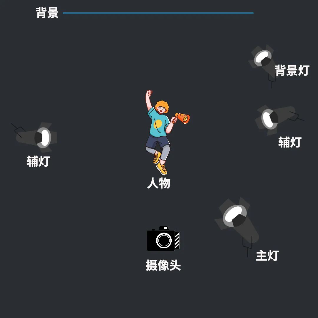 辅助灯放在主播的两侧,让人物更立体。背景灯放在主播的斜后侧,朝向背景,让整体画面更具空间感。