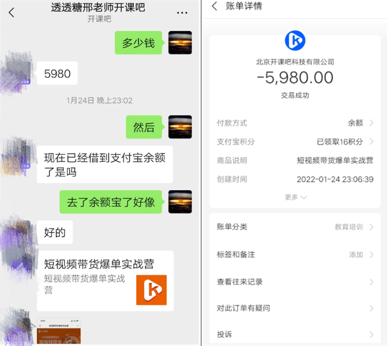 承诺的是“亲自1对1手把手教会”,付完款后,完全由开课吧工作人员接受,也联系不到“透透糖”本人。小公举观察到,这个用户似乎是借钱到支付宝余额里,然后付款的,这就真是血汗钱了。