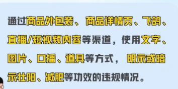 包括但不限于通过商品外包装、商品详情页、飞鸽、直播、短视频内容等渠道,使用文字、图片、口播道具等方式明示或暗时壮阳、减肥等功效的违规情况。